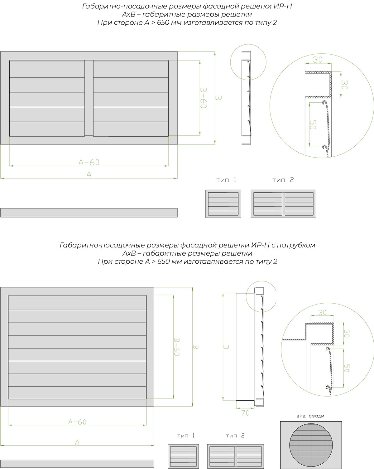 Решетка ИР-Н по назначению и функциональности полностью повторяет инерционную решетку ИР. Единственным конструктивным отличием является накладной тип исполнения, ее рамка сделана без внешнего фланца. Решетка ИР-Н накладывается на проем, либо полностью утапливается в проеме.