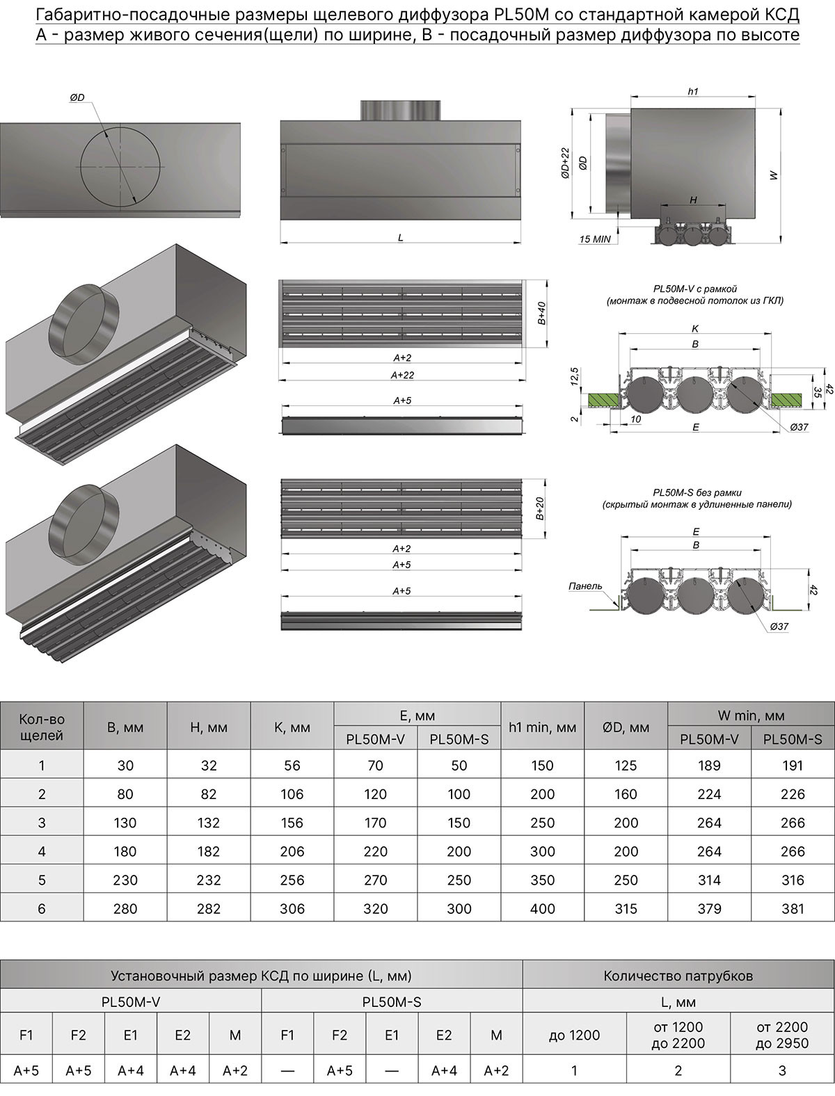 Монтаж. Рекомендованная высота для установки диффузора PL50M не более 4 м. Монтаж производится с помощью винтового соединения к закладным деталям в КСД через специальные изделия для крепления. В случае монтажа непрерывной конструкции, необходимо устанавливать в места соединения выравнивающие пластины. Изделия для крепления диффузоров входят в комплект поставки. После монтажа диффузора PL50M-V видимой частью остается рамка и щели, для PL50M-S только щели.