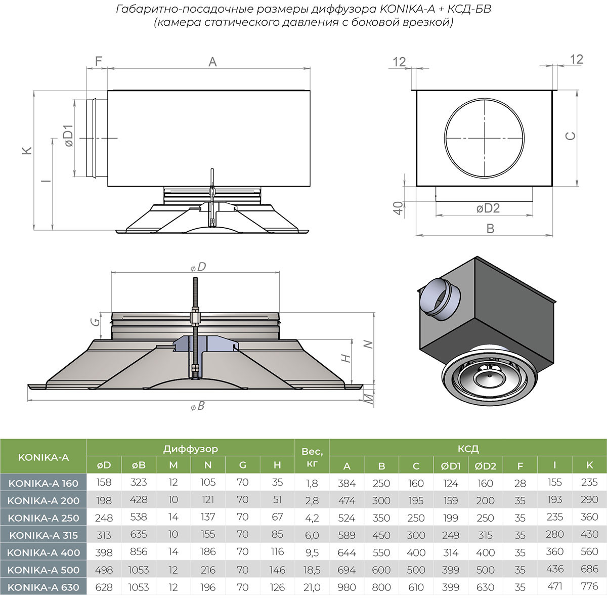 Возможна комплектация сегментным клапаном для регулировки объема приточного воздуха (S), удлинителем (U), а также камерой статического давления (КСД/КСР).