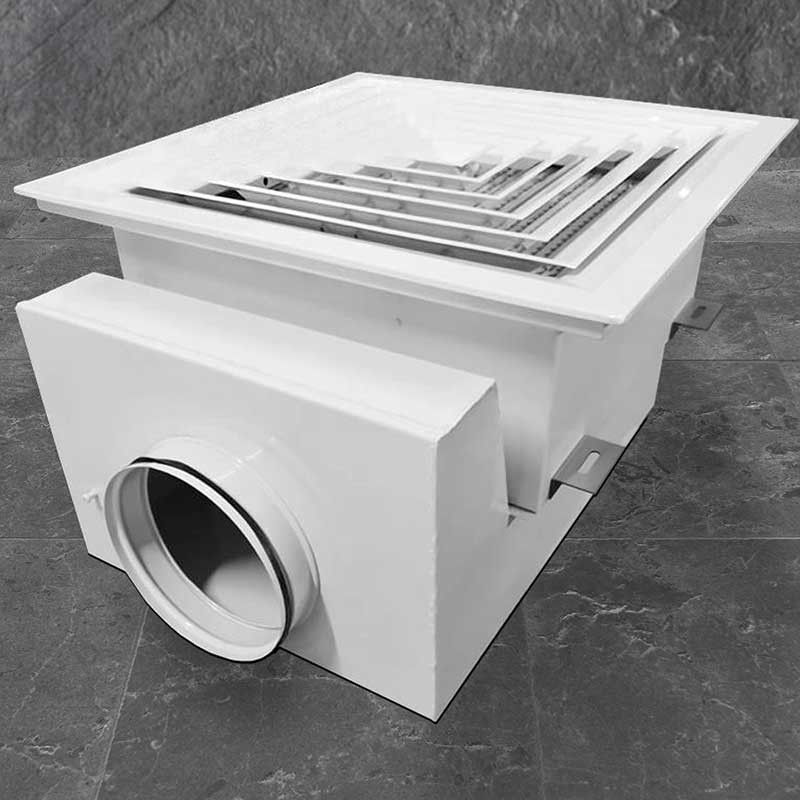 Заказать потолочный воздухораспределитель с блоком уменьшенной высоты с круглым патрубком и боковым подводом.